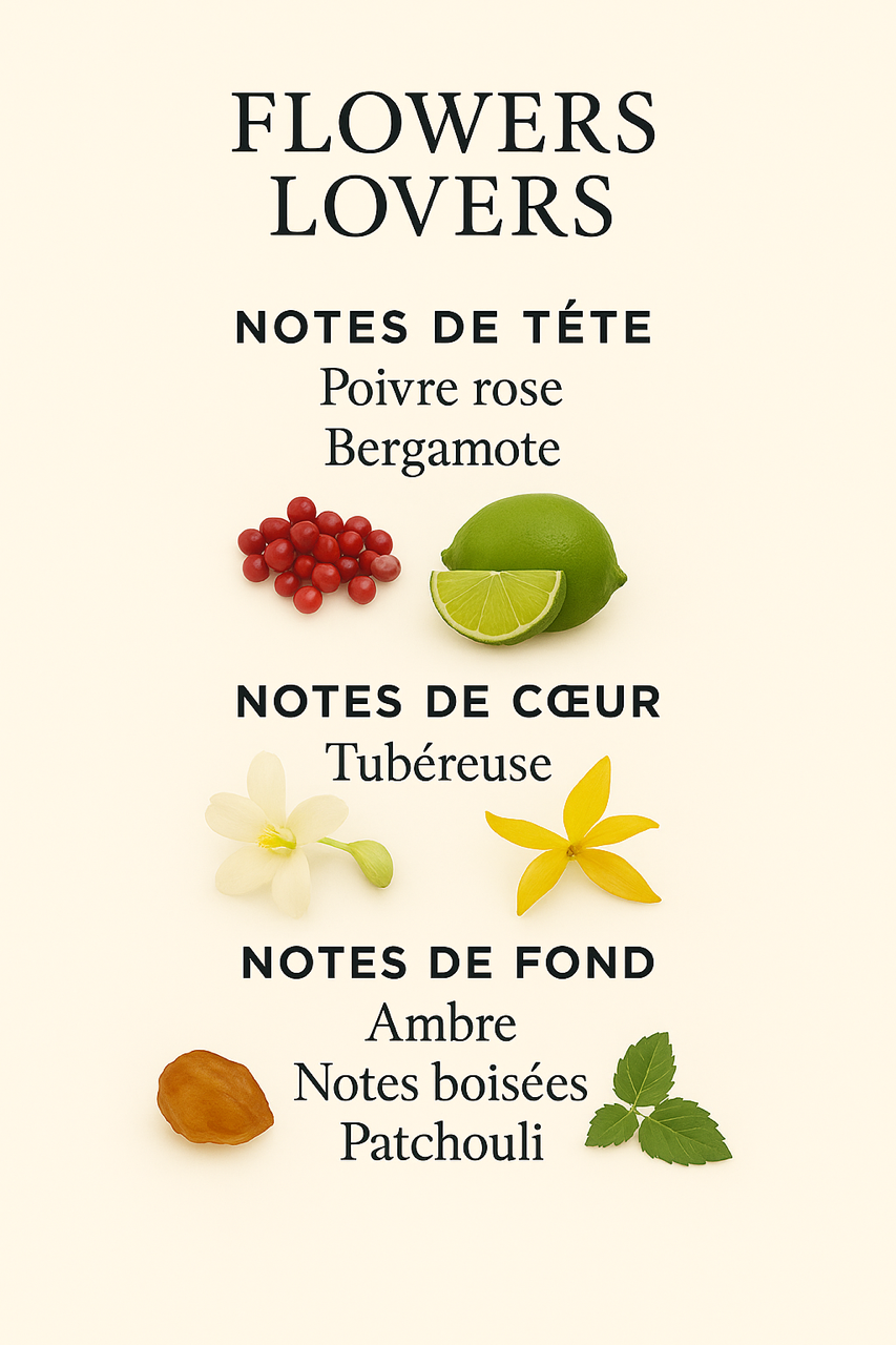 Flowers Lovers s’ouvre sur un souffle pétillant de bergamote relevé par une pointe de poivre rose.