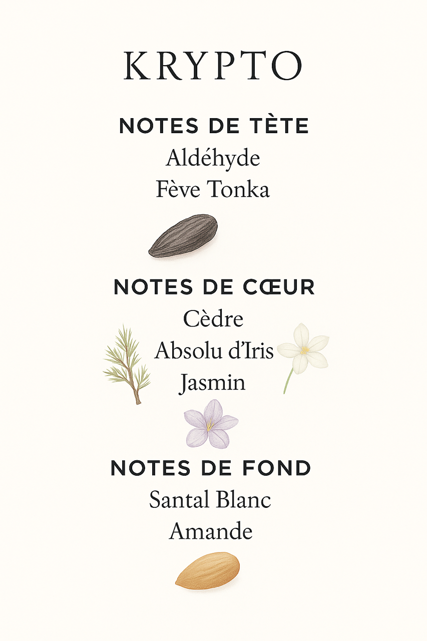 Krypto est une fragrance puissante et enveloppante rend hommage aux aldéhydes, ces notes effervescentes souvent réservées à la haute parfumerie. Conçue pour celles et ceux qui veulent captiver par leur présence, tout en laissant une trace subtile, élégante et unique.
